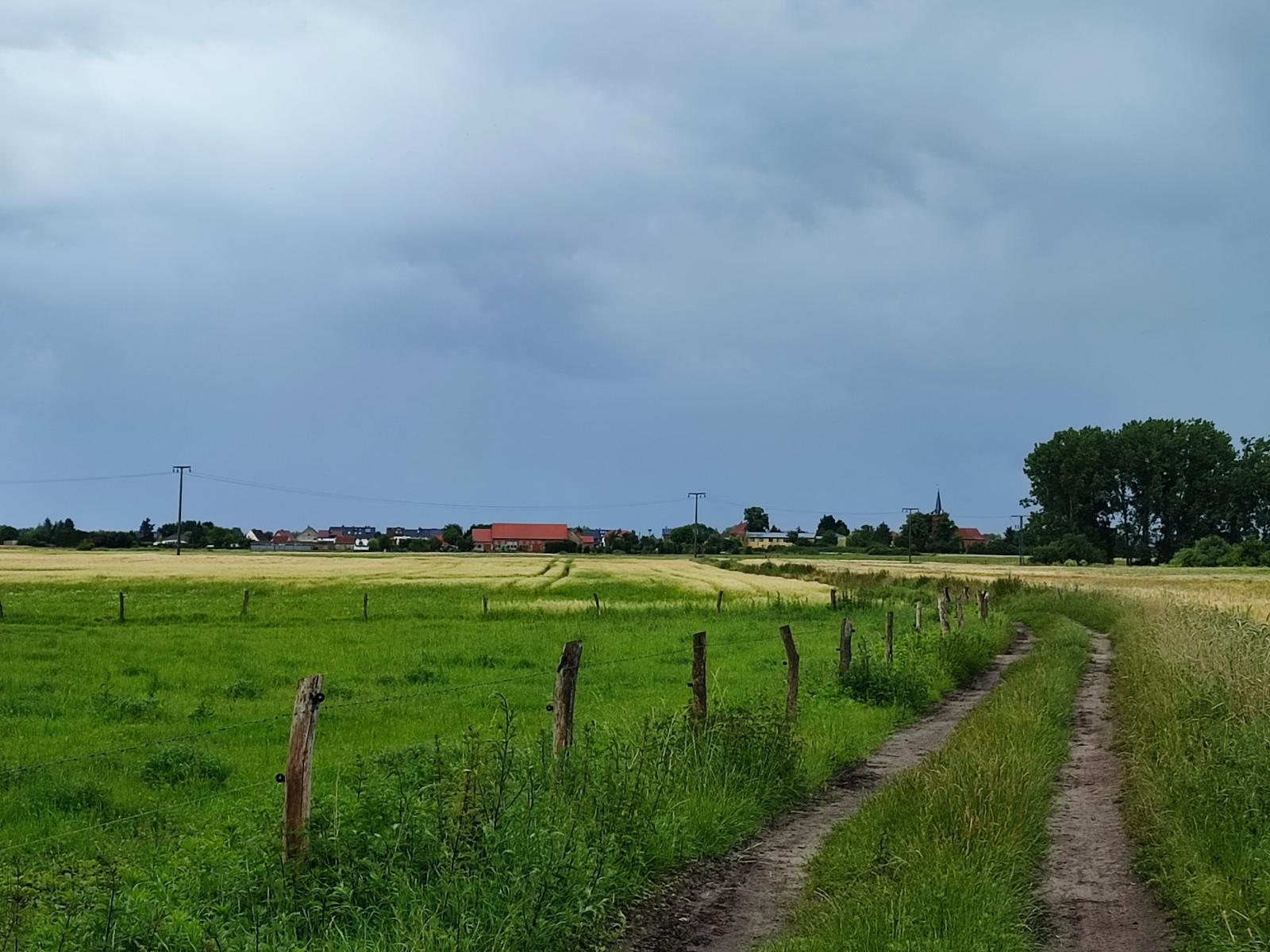 Als ich den Wald verlasse und die Mücken frustriert kehrt machen, tut sich ein neues Panorama auf. Schmerzke liegt pittoresk, mit Kirchturm und Scheunen, vor mir in den Feldern. Ich mache einen eleganten Schlenker um einige Kuhställe und laufe auf Schmerzke zu. Hinter einer Hecke lauern mir ein paar Kühe auf. Selbstbewusst schreite ich vorbei. Man grüßt sich schweigend und wendet sich dann weiter seinen Tätigkeiten zu. Die Kühe grasen. Ich wandere.